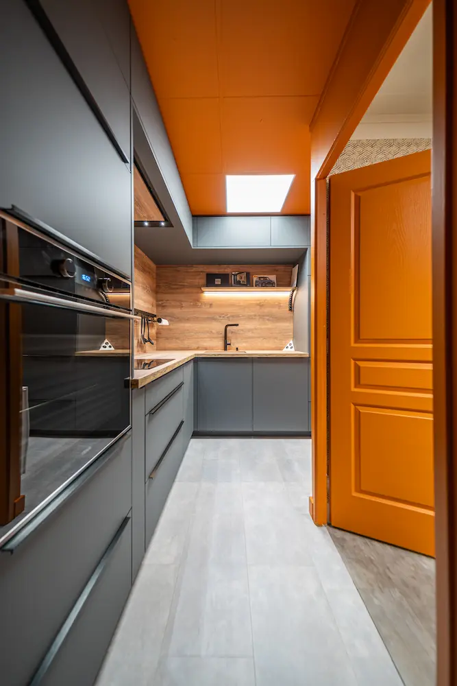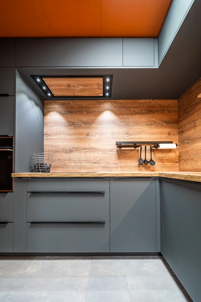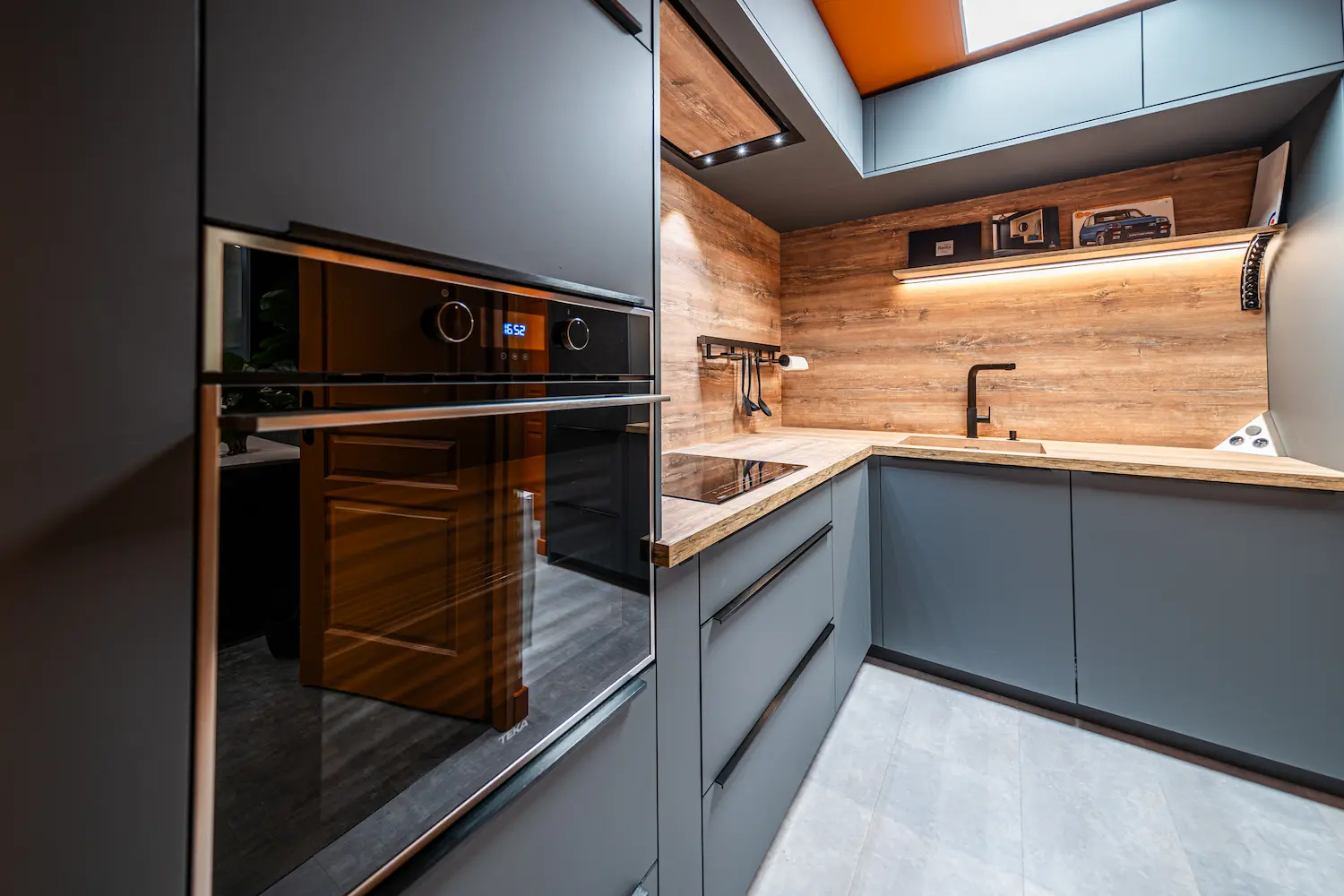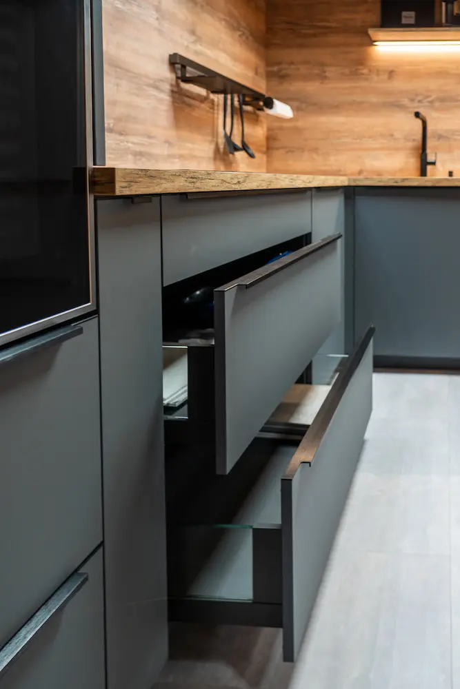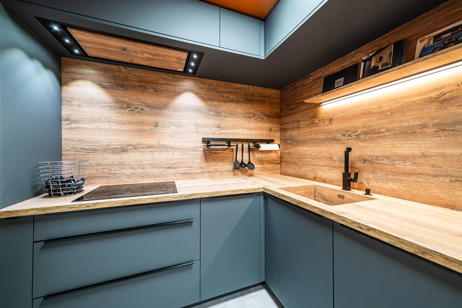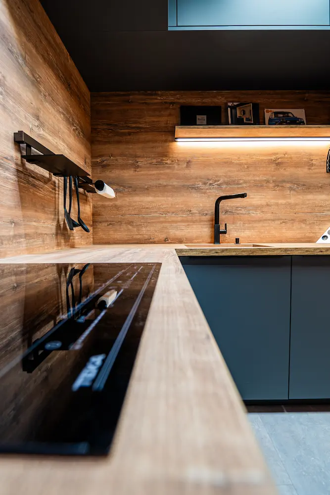 Son plan de travail en compact intègre un évier de la même matière et de la même teinte, créant ainsi une continuité élégante et discrète. Un détail qui apporte esthétique et commodité à cette cuisine.