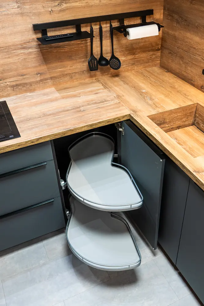 Les meubles d’angle type LeMans transforment chaque recoin en espace utile au moyen de ses plateaux qui sortent entièrement de l’angle pour un accès simple et pratique à vos ustensiles.