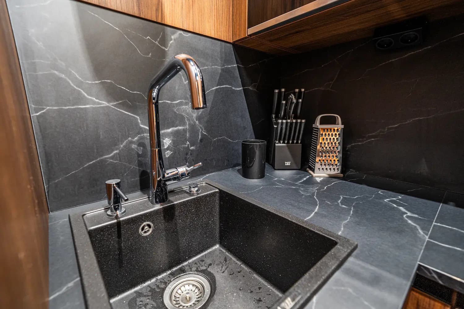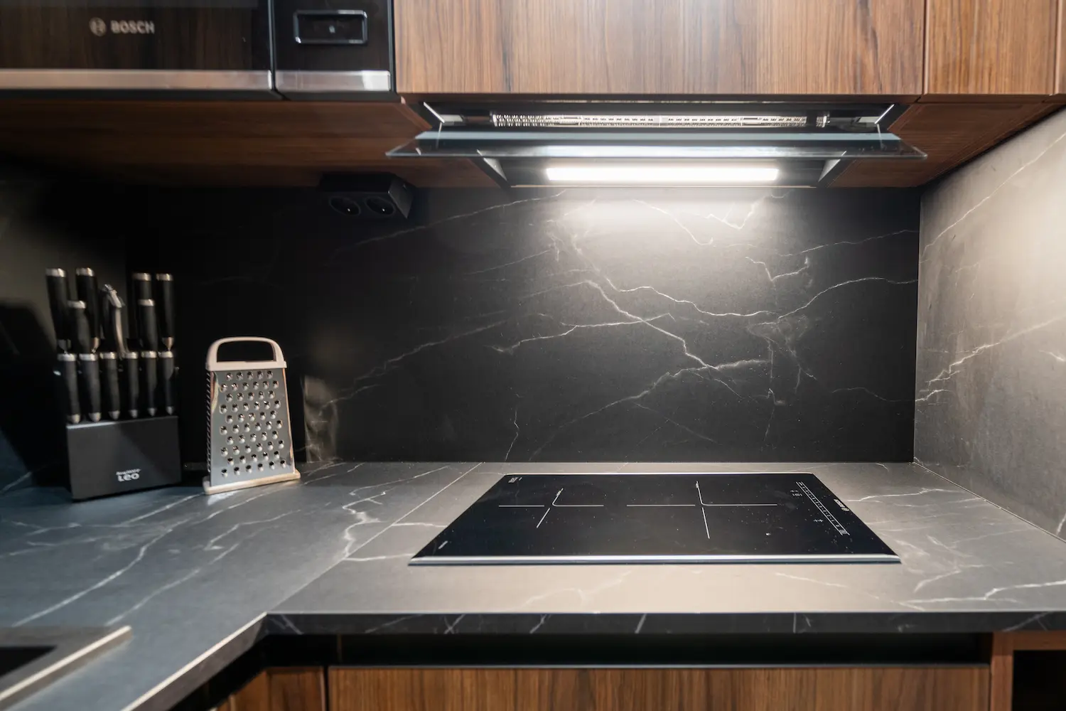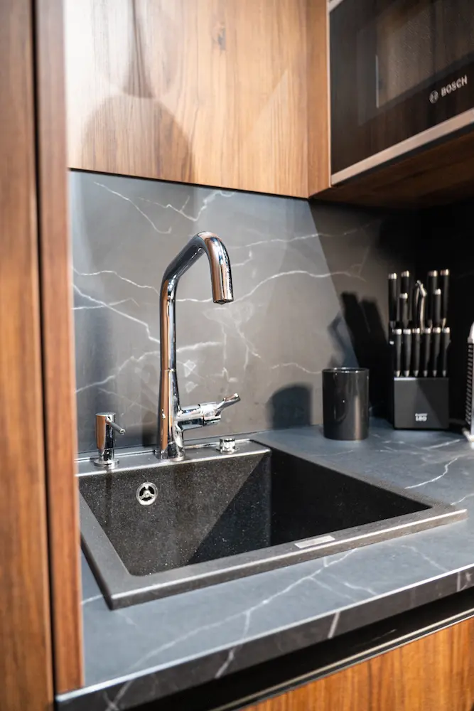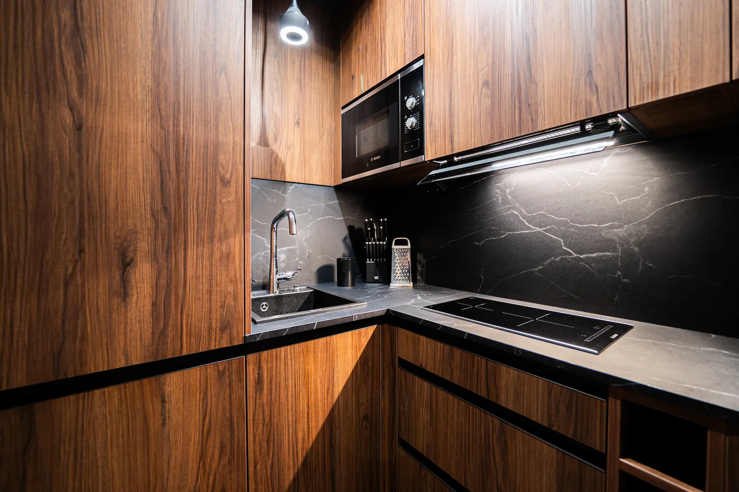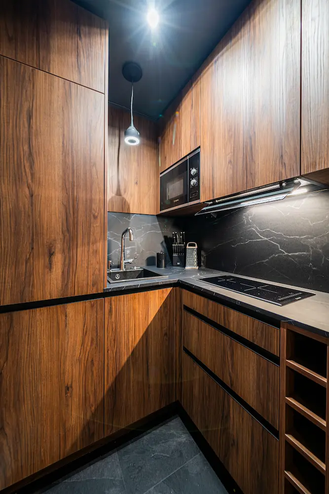 L’association du bois, chaleureux et accueillant, avec le plan de travail imitant la pierre noire, confère à l’espace un style contemporain et sophistiqué.