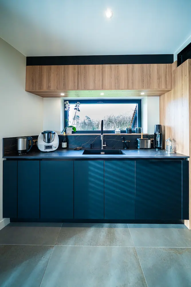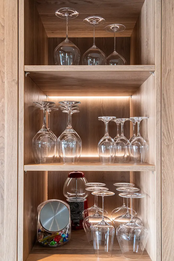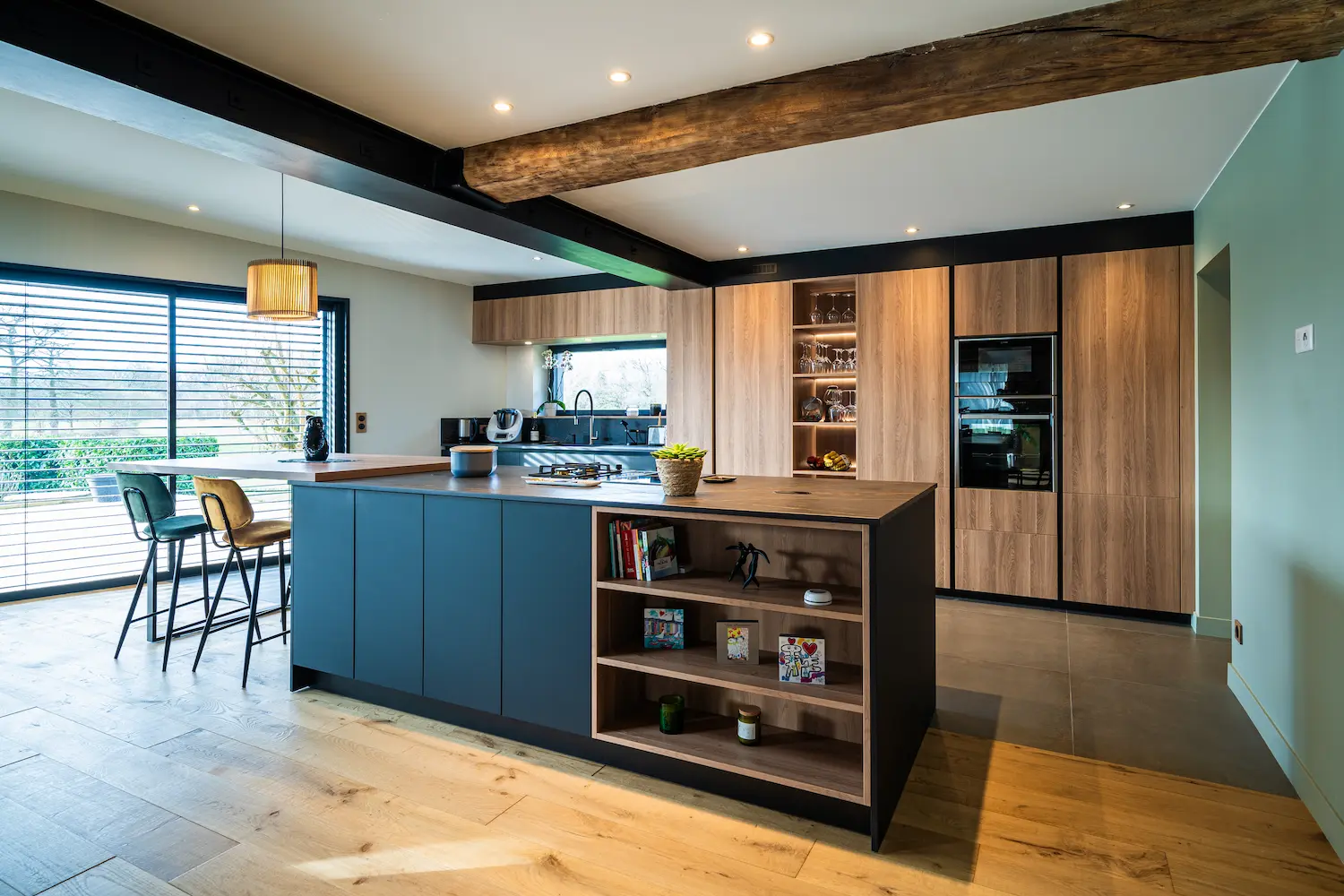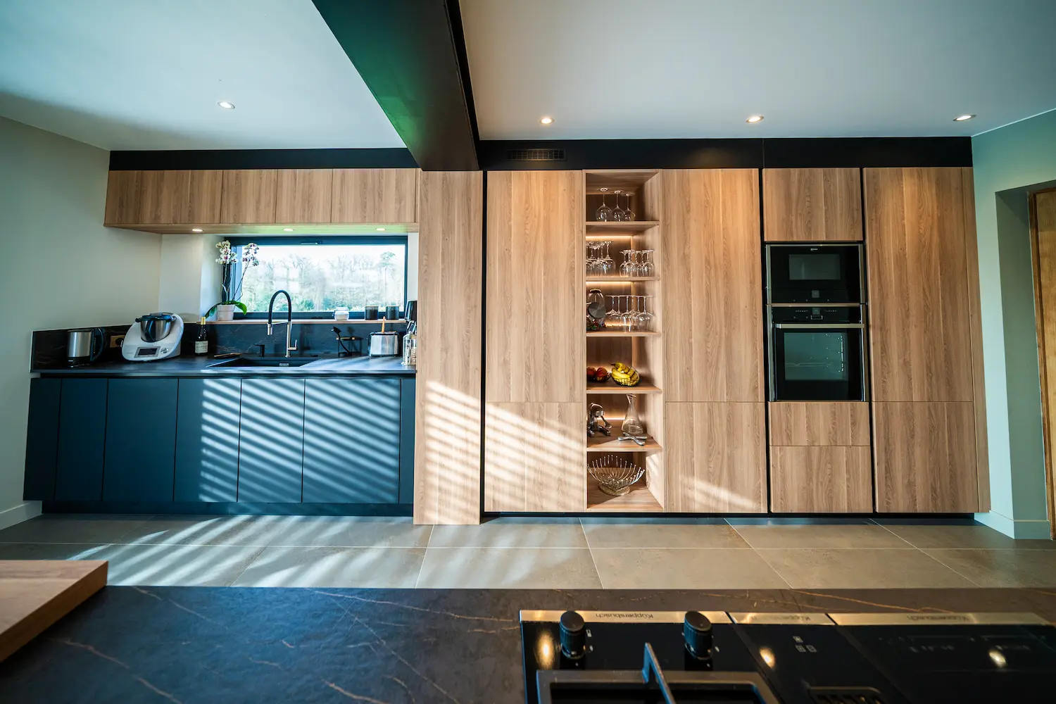 La niche aspect bois, réalisée dans la même teinte que les façades, et l’intérieur des meubles créent une continuité visuelle élégante et renforcent l’harmonie de cette cuisine.