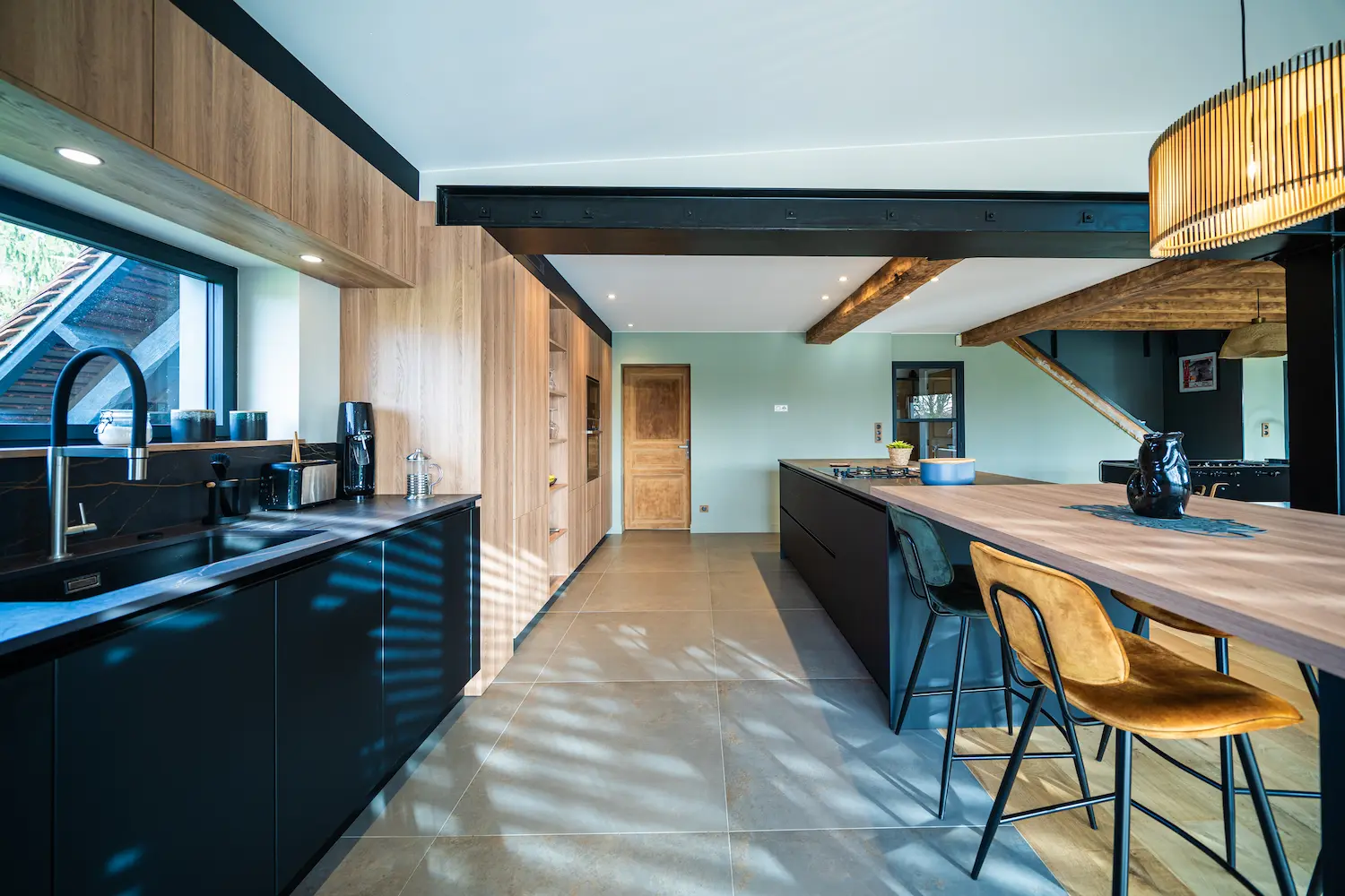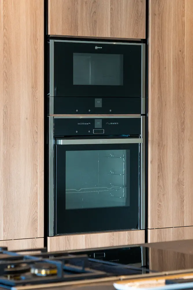 L’ensemble Neff avec son four Slide & Hide apporte confort et modernité, parfaitement adapté à l’esprit convivial de cette cuisine familiale.