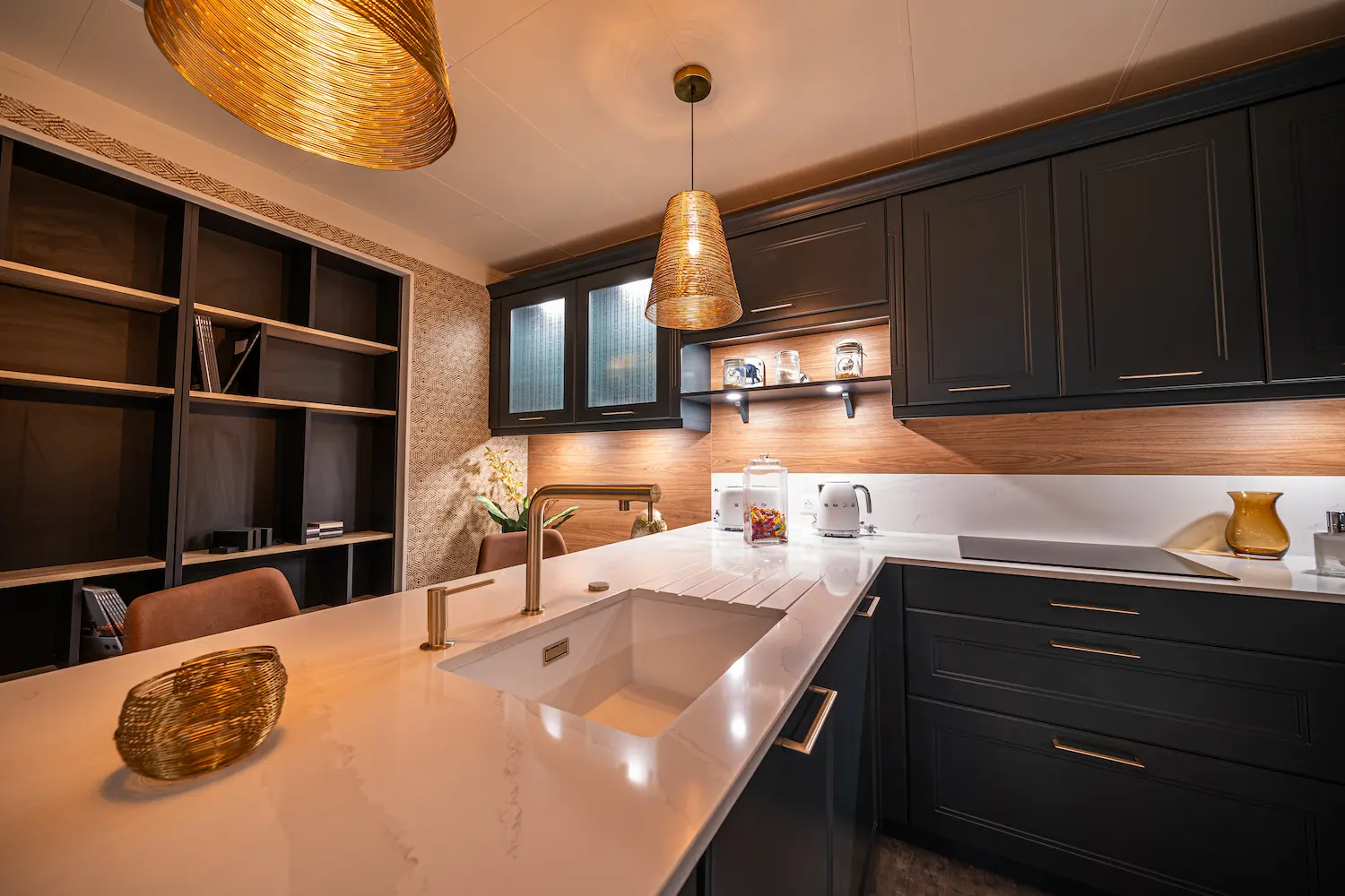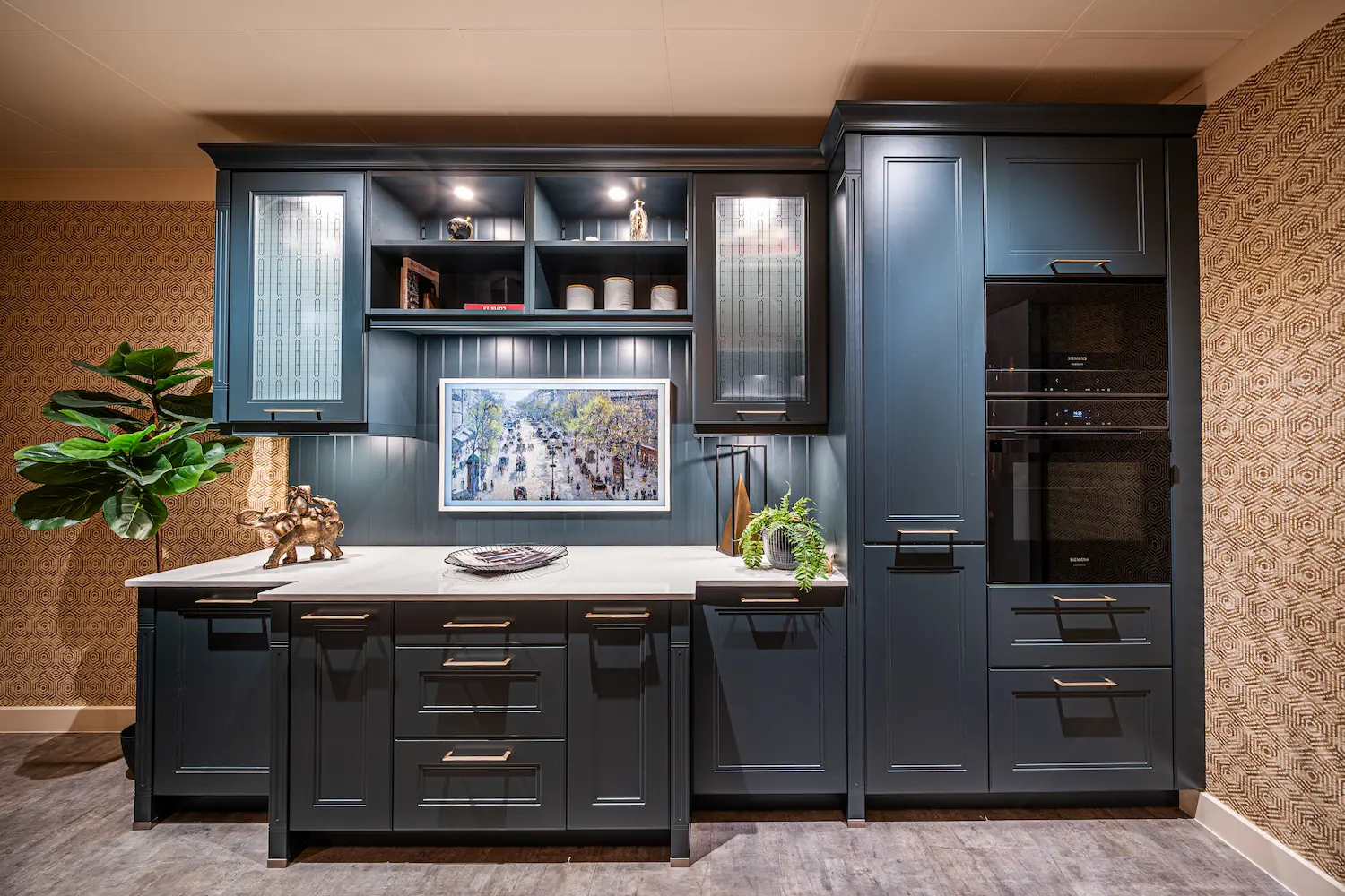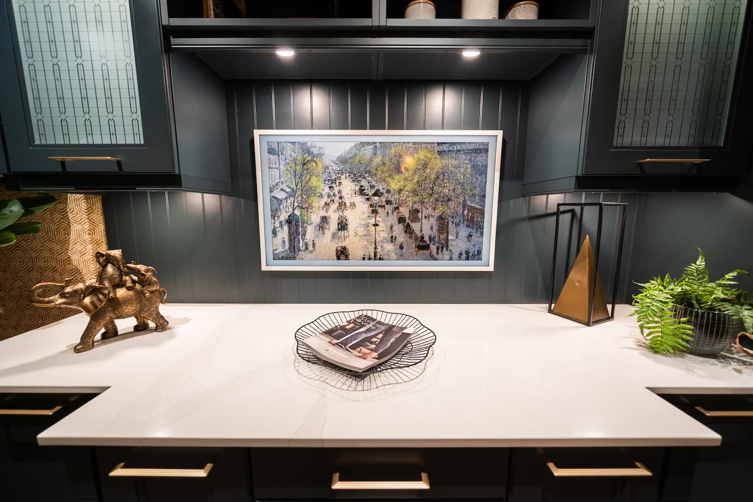 L’harmonisation unique des couleurs, qui s’étend jusqu’à l’écran de veille du téléviseur Samsung Frame, crée une ambiance déco harmonieuse et raffinée entre la cuisine et le séjour.