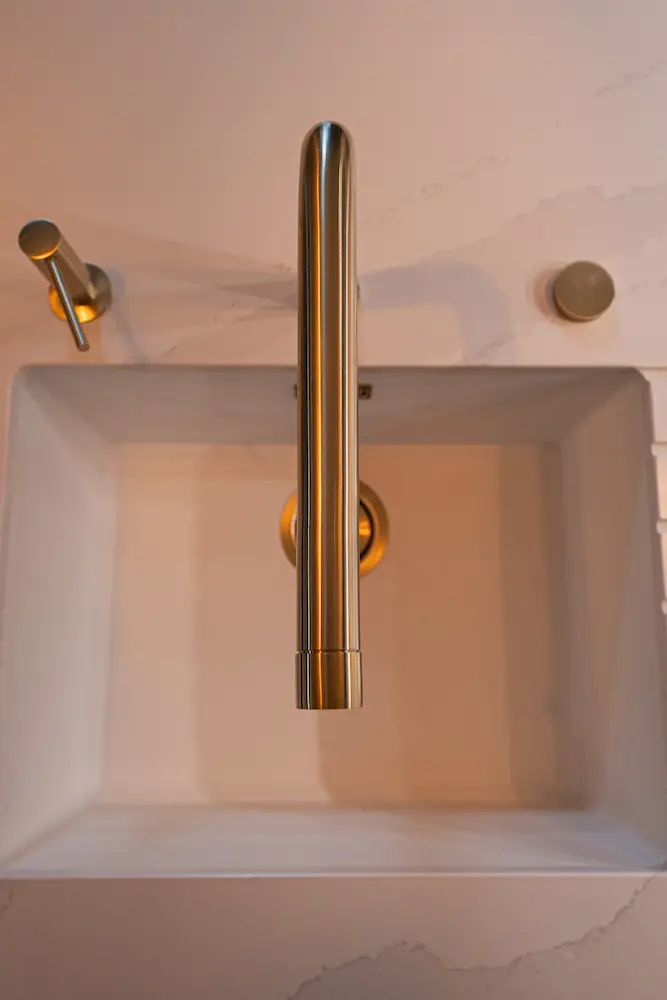 Le mitigeur, le distributeur à savon et le vidage automatique en laiton Bradano rappellent subtilement les poignées de la cuisine.